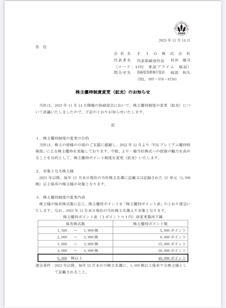 移動体通信システム主力のモバイルクリエイトが子会社・REALIZEと共同持株会社設立しているFIGが株主優待制度の拡充を発表しました。