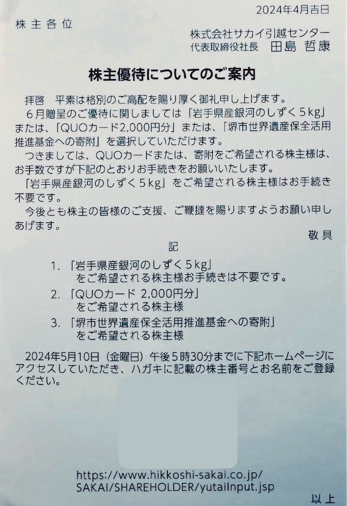 サカイ引越センターの株主優待は、お米やQUOカードを選択させてくれるので、人気の優待ですね!